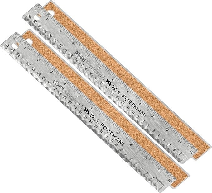 The cork backing prevents the ruler from slipping, while the metal edge guides a blade for precise, straight cuts.